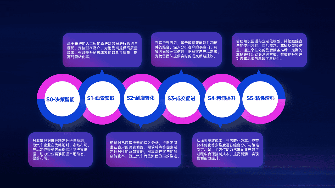 通过拓宽潜在客户来源、、优化线索分配并提高到店转化率,,,,以增强销售效率。。。。同时,,利用线索数据不断优化分析模型,,有效提升转化率,,,扩大营销影响力。。